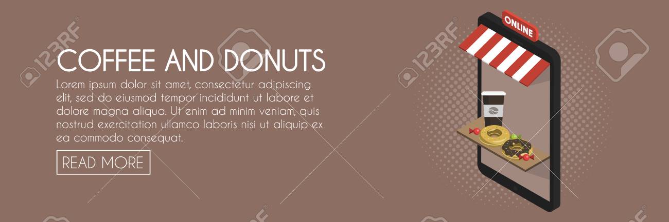 Vettoriale Concetto Di Negozio Online Di Caffe E Ciambelle Illustrazione Isometrica Di Vettore Di Vetrina Del Negozio Modello Di Banner Web Image 83739352