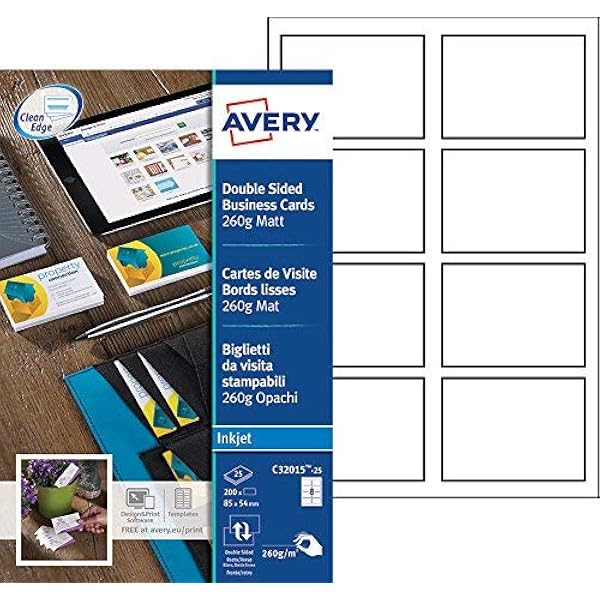 Avery Italia C32015 25 Biglietto Da Visita 85 X 54 Mm Stampabile Fronte Retro 8 Biglietti Per Foglio Confezione Da 25 Pezzi Bianco Amazon It Cancelleria E Prodotti Per Ufficio