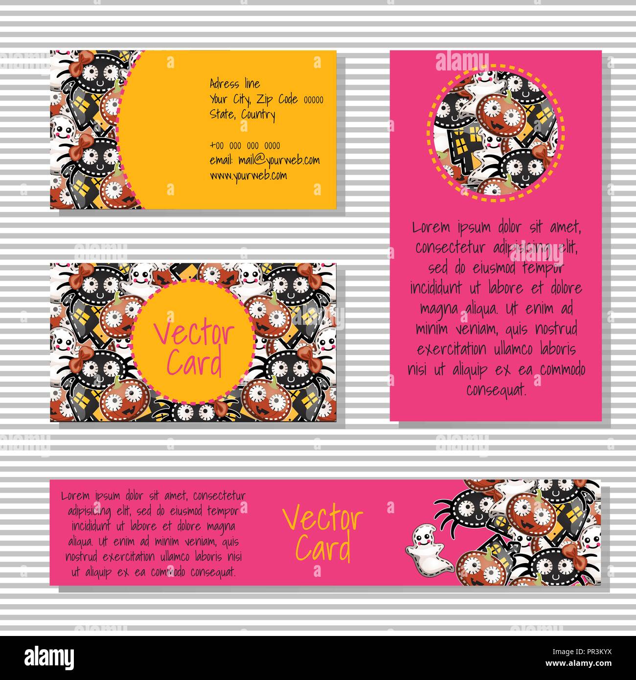 Elegante Modello Con Design Moderno Di Vacanza Creativa O Biglietto Da Visita Elementi Decorativi In Stile Di Vacanza Di Spirito Cattivo Halloween Su Sfondo A Strisce Vector Cartoon Close Up Illustrazione Immagine E