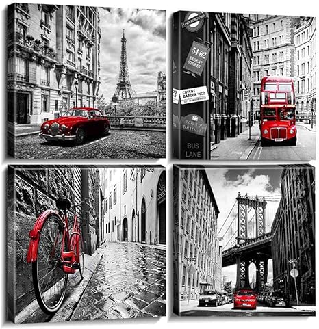 Kkjj Quadro Su Tela Immagine Di Arte Della Parete Bianco E Nero Citta Del Paesaggio Di Parigi Stampa Su Tela Murale Di Pittura Decorativa Auto Rossa Per Ristorante Hotel Soggiorno Cucina 40x40cmx4 Amazon It